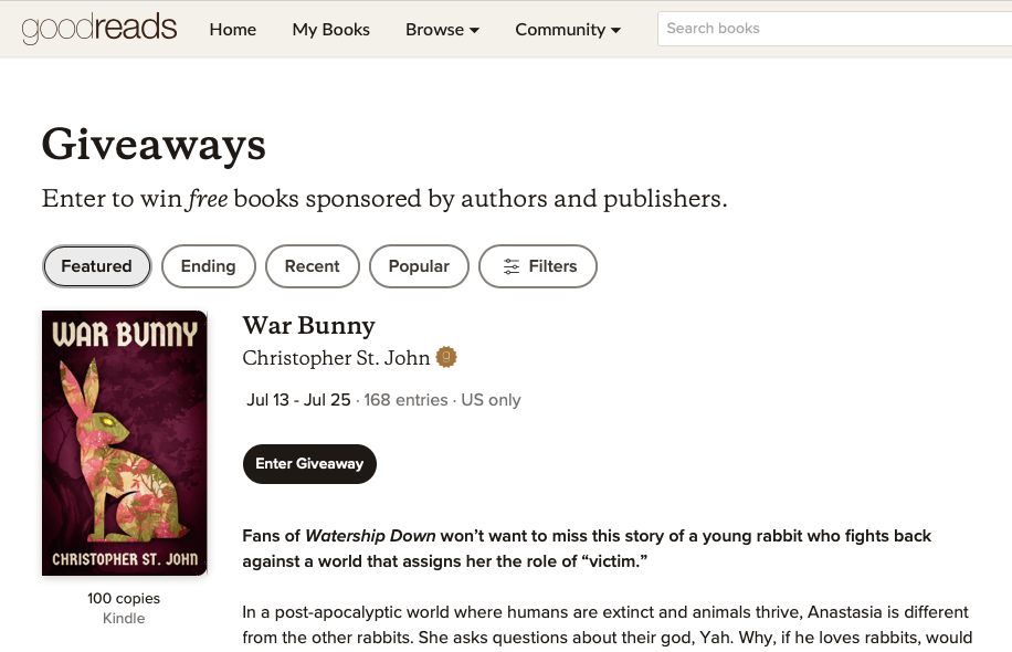 Goodreads is giving away 100 copies of my new novel, War Bunny! If you’re on Goodreads, enter to win a free War Bunny eBook today!
